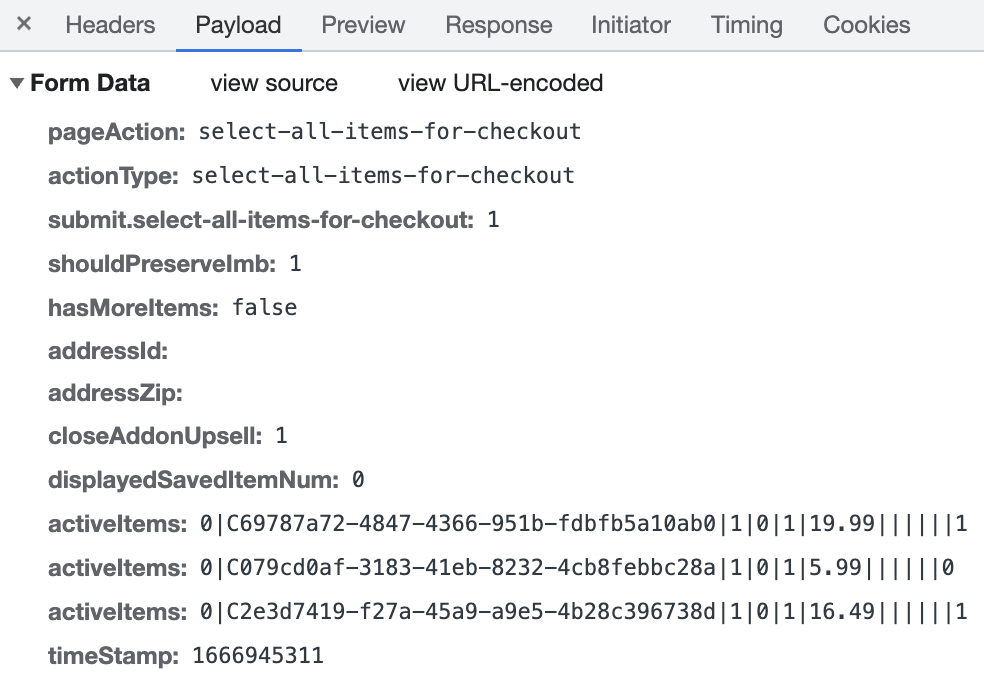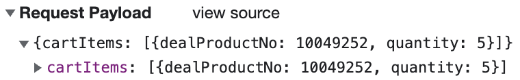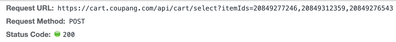 아마존이 특이한 점은 페이로드에 변경되어야할 boolean 값이 전달되지만 보내는 api 주소 자체가 다르다. true로 바뀌어야할 때는 주소 맨 뒤의 숫자가 1이고 false는 0이다. 모두 선택의 경우는 바뀌어야할 아이템들의 아이디 함께도 전달되면서 원래 상태도 전달된다.